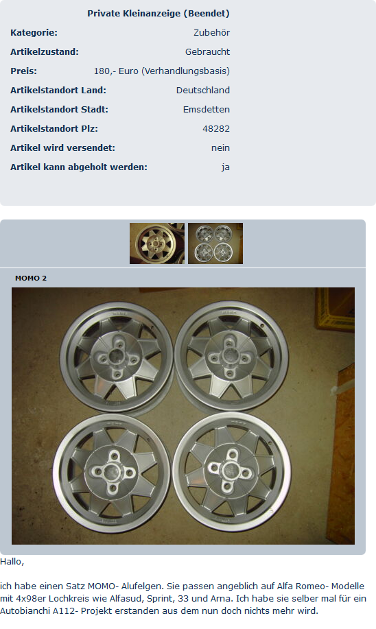 ein Kanadischer Kontakt sucht eine Quelle für die angehängte Felge vom Typ Momo 13", 4 x 98 magnesium, die selbst ich bisher kaum gesehen habe.