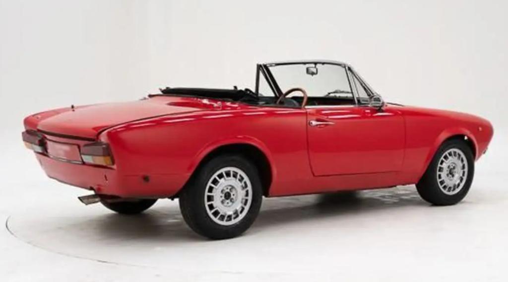 (1)16.408 km. 16.408 km. Manual transmission. This Fiat 124 Spider was first registered on May 17, 1969, and is in largely original condition. The car presents itself in its original red color, with a roof made of Sonneland fabric. Bodywork: Original – signs of use, bodywork needs alignment. Paintwork: Original color – damages present, partly needs redoing. Underside: Surface rust and welding needed – exhaust aged and needs replacement. Interior: Recently restored – carpets in excellent condition, hood in Sonneland fabric but aged. Mechanics: Engine in fair condition – clutch and gearbox work perfectly. Brakes: Operate, but rear adjustment needed. Electronics: Windshield wipers work – heating, dashboard and horn do not work. Lighting: High beams, reverse lights and license plate light do not work – repair required. Suspension: Bushings worn – slight play left and right. For sale: EUR 9.950.