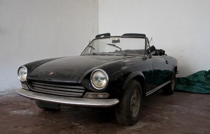 the car is a black 124 Spider AS with the small 1.4 liters engine and a 5 speed manual gearbox. Overall conditions are pretty good for a car that has been stuck in a garage for 15 years but of course it needs a lot of maintenance before rolling on the roads. I just want to put the car back on the road, give a proper clean to it and then make some modifications on the outside and to the engine. For sure I'll make it bumper-less. Found at fiatspider.com.