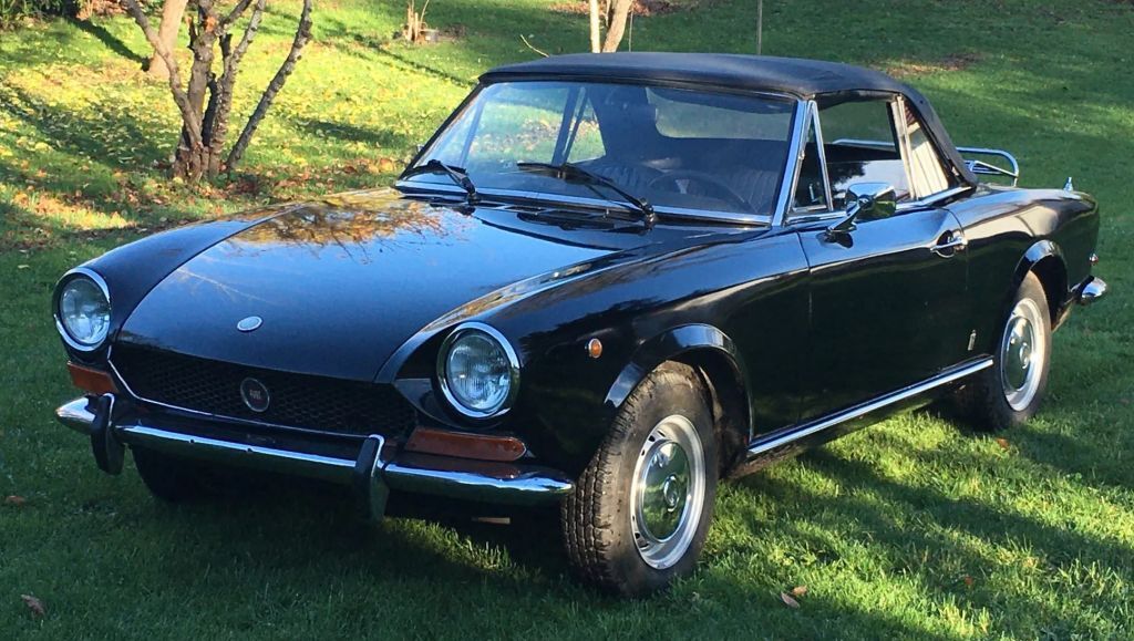 46k Miles Shown. This 1968 Fiat 124 Sport Spider is said to have spent time in Germany before being brought to the US, where it was acquired by the seller in September 2000. It is powered by a 1.4-liter inline-four paired with a five-speed manual transmission and finished in black with a black convertible soft top over black vinyl. Equipment includes 13″ steel wheels and four-wheel disc brakes along with an AM/FM cassette stereo, a heater, and a luggage rack. Service in November 2023 is noted to have involved replacing the timing belt and water pump. This 124 Sport Spider is now offered with an owner’s manual, a spare windshield and front grille, and a clean Oregon title in the seller’s name. Auctioned at BaT in 02/2024 for: Sold for $6,888