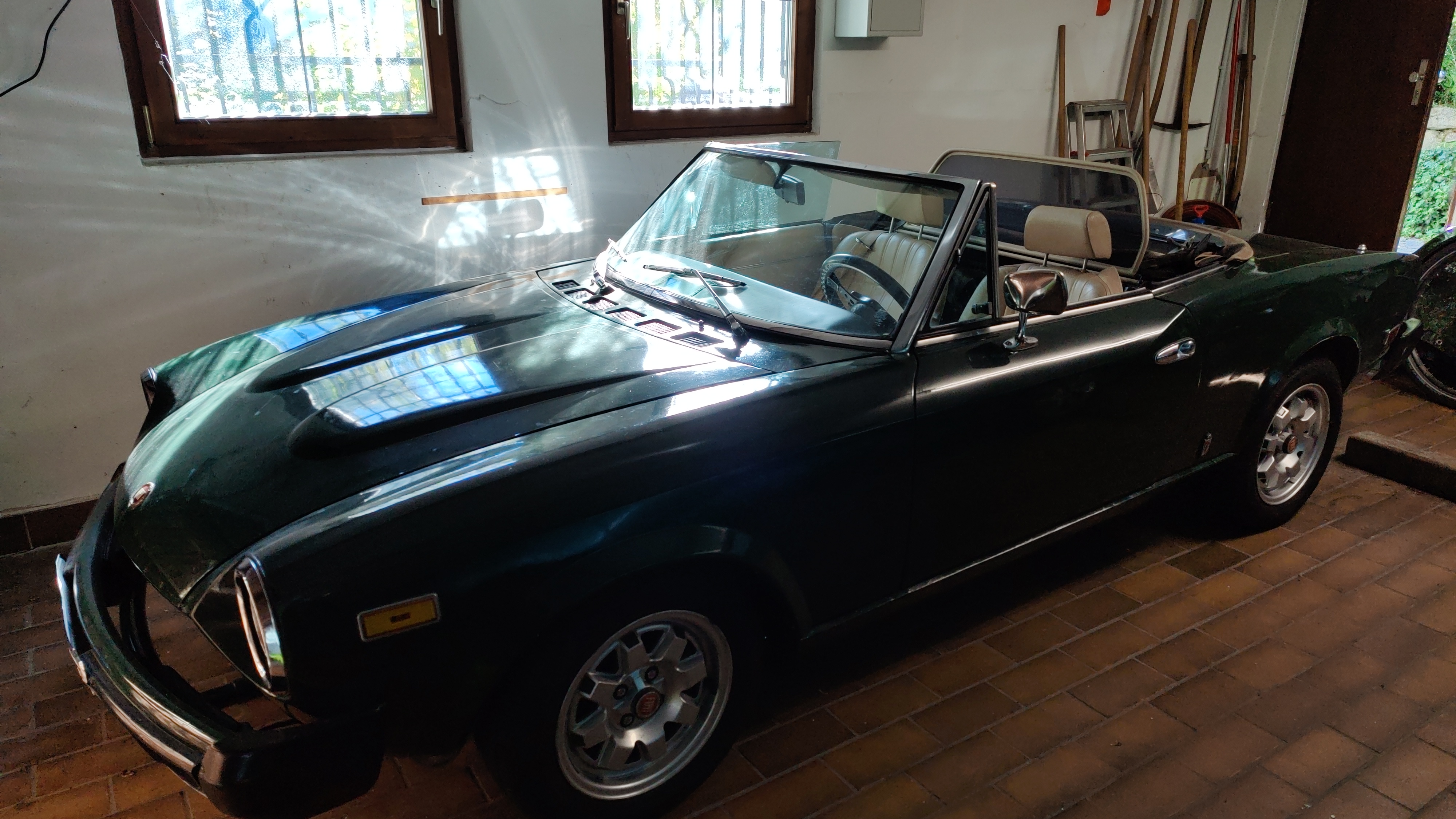 Fiat 124 Spider CS0 2000ie Automatik Bj. 1980. Reeimport aus den USA 1990. Laufleistung unbekannt. Instandsetzung 1990 Radläufe hinten, kleine Durchrostung Beifahrerseite, komplette Hohlraumkonservierung. Technische Erneuerung Bremsen und Fahrwerk. Tiefergelegt, Alufelgen, Raidlenkrad, Metallkat, alles eingetragen. 25 Jahre nur im Sommer gefahren. Dazwischen Einbau eines Motors und der Hinterachse mit 20 Tkm eines Unfallfahrzeugs 1984. Ebenso Einbau eines fabrikneuen Getriebes. Hinterachse ist von einem Schaltgetriebe und passt nicht zum Automatikgetriebe, dadurch aber bessere Beschleunigung. Laufleistung ca. 70Tkm, aber wegen andauernder Probleme mit Tachowellen und Tachos kein Nachweis. Technisch immer instandgehalten, Innenausstattung umgebaut auf Echtleder, hinten Sitzbank entfernt. Einbau Soundbar. Armaturenbrett zeitgenössischer Umbau auf mehr Instrumente. Innen im Wesentlichen nichts mehr original. Thermoplastiklackierung entfernt, aber aus Kostengründen keine sachgemäße Lackierung, nur aufgerollt. Optisch auf puristisch umgebaut, Chrom überlackiert, Edelstahlelemente entfernt (sind noch vorhanden). Vorderachse Umbau auf PUR-Buchsen.