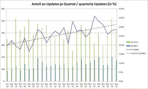 jeweils zum Quartalsende werden die Statistiken erneuert und es gibt einen neuen Trend zu entdecken. Der Anteil der Updates von bestehenden Einträgen ggü. neu erfassten Fahrzeugen steigt kontinuierlich an.  Im Zeitraum der letzten 6 Jahre erhöhte sich der Anteil der Updates von knapp 20% auf über 30%.