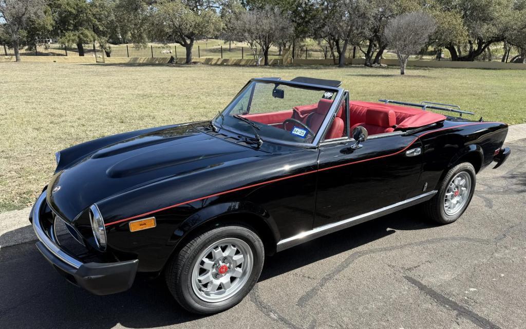 VIN: ZFAAS00B0C8188516. 44k Miles Shown. This 1982 Fiat Spider 2000 was refurbished under previous ownership in 2020 in black over a custom red leather interior, and additional work included the installation of a replacement black convertible top and a wood-rimmed steering wheel along with replacing the timing belt, thermostat, and assorted braking and suspension components. Powered by a 2.0-liter inline-four paired with a five-speed manual transmission, the car has retrofitted rack-and-pinion steering, four-wheel disc brakes, 14″ Cromodora alloy wheels, an Alpine Bluetooth stereo, and a heater. Acquired by the seller in 2023, this Spider 2000 is now offered with a red leather tonneau cover, a preliminary refurbishment summary from 2020, and a clean Texas title in the seller’s name. Auctioned at BatT in 03/2025 for: Current Bid: USD $3,000